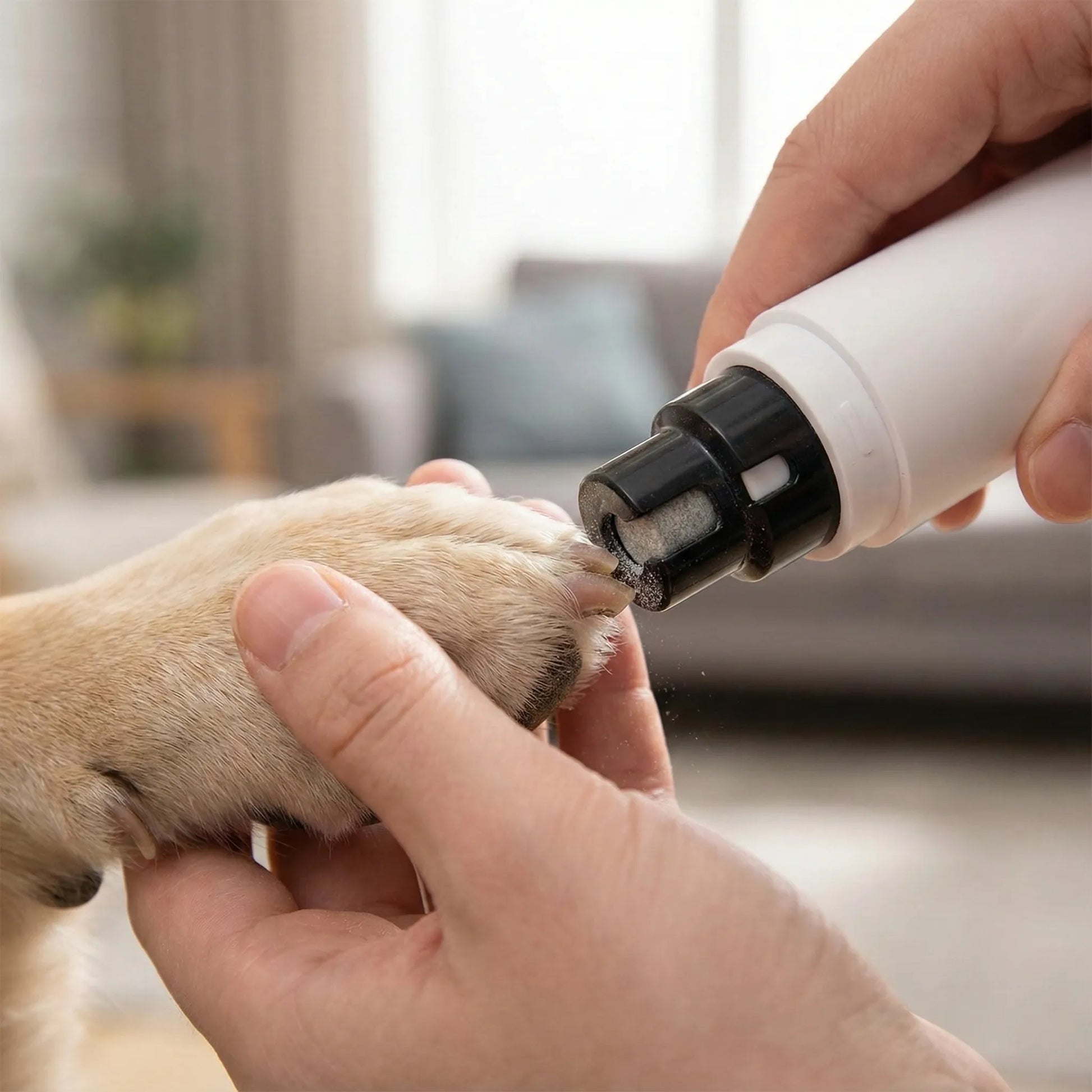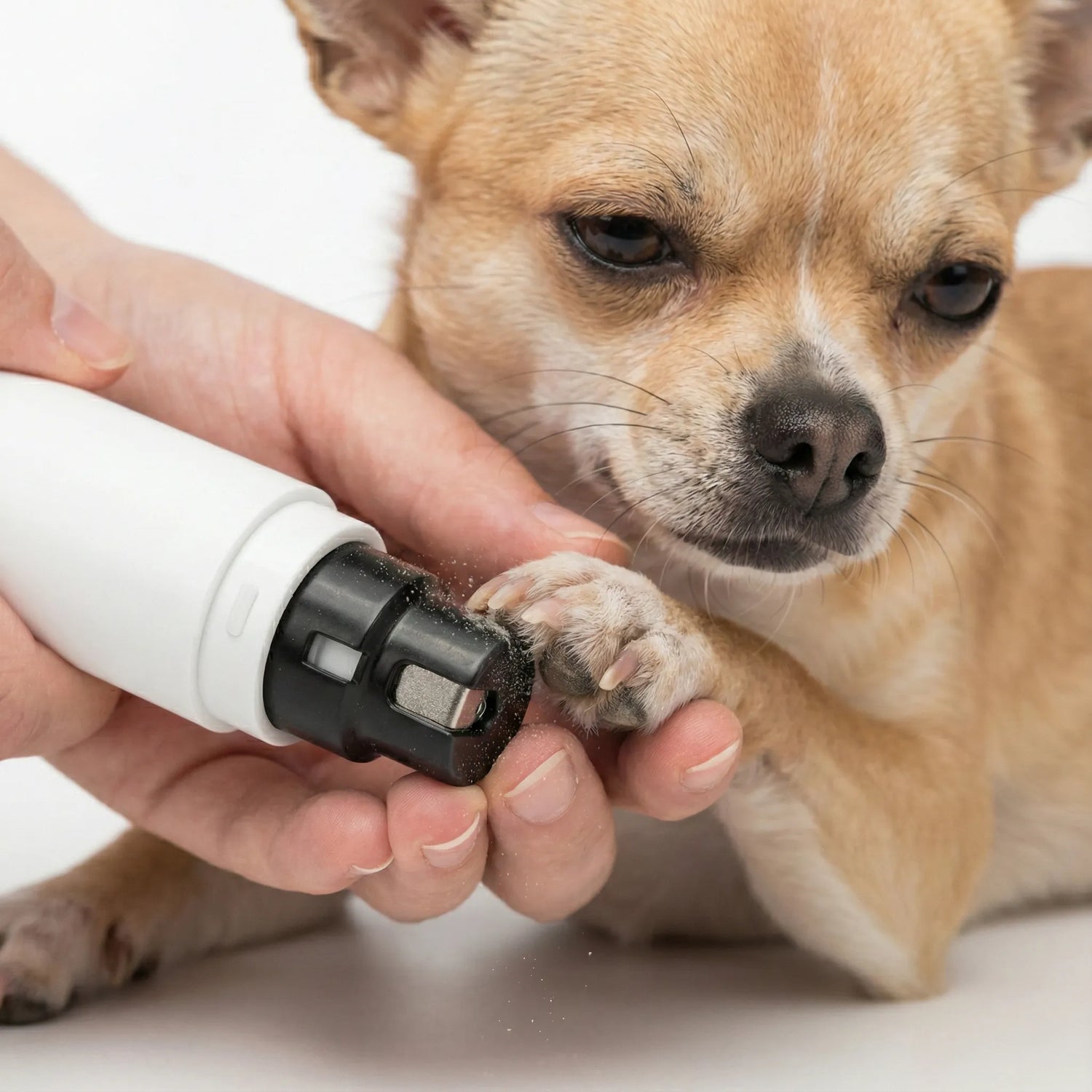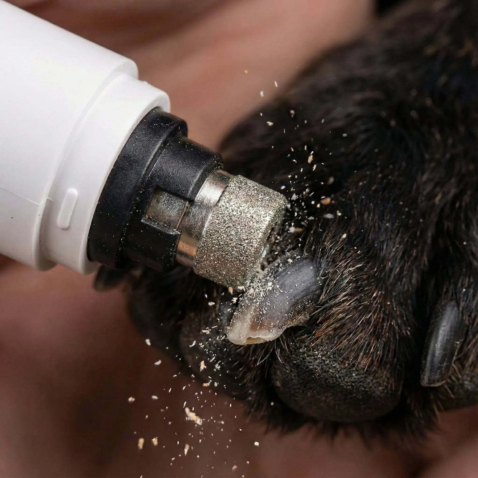 Nothing painful! The diamond bit is designed to grind hard surfaces (nails) effectively but is gentle on soft surfaces. If you accidentally brush against your dog's skin or fur, it generally just tickles or stops spinning, unlike a sharp blade that cuts instantly. It is much more forgiving for "shaky hands" than clippers.
